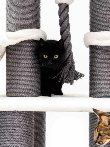 Le Skyline 186 n’est pas un arbre à chat ordinaire. C’est un penthouse en peluche, spécialement conçu pour les vrais chanceux. Car avouez-le : une grande maison pour dormir, des troncs extra épais pour faire les griffes et un immense panier de repos tout en haut ? Waouh ! Et si ton chat s’est un peu assoupi en montant, il peut se laisser tomber en toute tranquillité dans l’un des quatre hamacs super moelleux. C’est ça, la vie de chat de luxe ! Cette tour pour chat est parfaite pour les grimpeurs, les gratteurs enthousiastes et les champions de la sieste. Et les troncs en sisal solides résistent aux griffes les plus acérées.