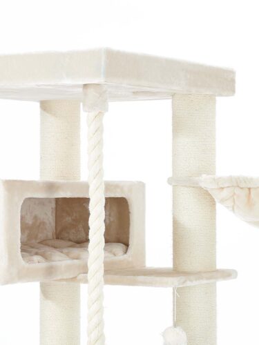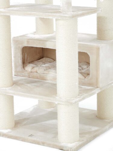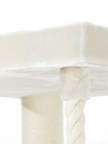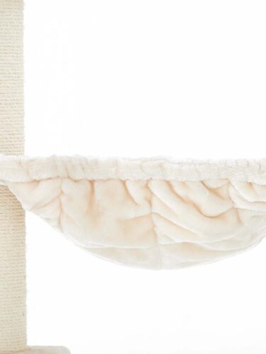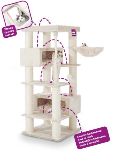 couleurs – peluche crème et sisal natureldimensions – longueur 76 cm, largeur 76 cm et hauteur 190 cmun hamac généreux de 48 x 48 cm2 niches XXL mesurant 76 x 30 cm et 30 cm de hautune corde de jeu fixe et une plaque de base très épaisse