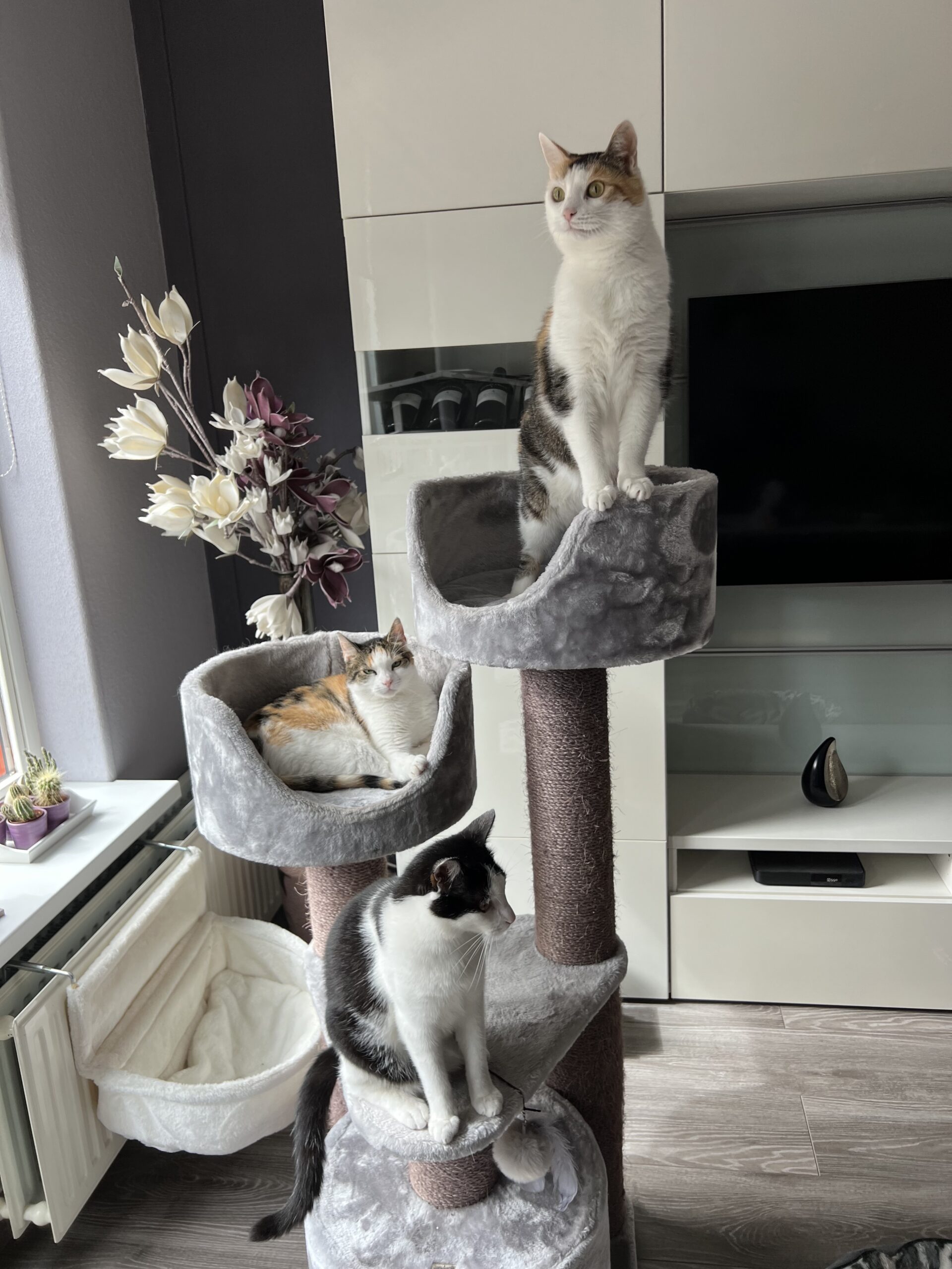 2 der 3 Fellnasen haben sich sofort über die neuen Kratzbäume hergemacht und sind begeistert.