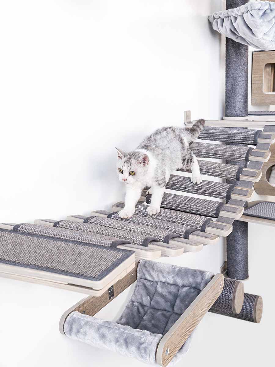 Le Bridge 140 est un élément super mignon qui vient s’ajouter à nos produits Wall of Rebels. Parce que c’est vraiment amusant quand ton chat peut passer de son endroit de repos à une planche à griffer cool grâce à ce pont pour chat ! Tu accroches le Bridge 140 ? Alors tu es sûr de faire le bonheur de ton chat, car les chats adorent être en hauteur. Ce pont pour chat fait partie de notre collection Mur des rebelles : ce sont de merveilleux produits pour que les chats puissent dormir, jouer, grimper, griffer et dormir. Et tu peux les combiner à l’infini ! Tu cherches aussi un endroit agréable pour que ton chat puisse dormir ou faire ses griffes ? Alors jette un coup d’œil au hamac Lazy 50 et à la planche à griffer Scratch 70.