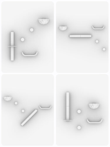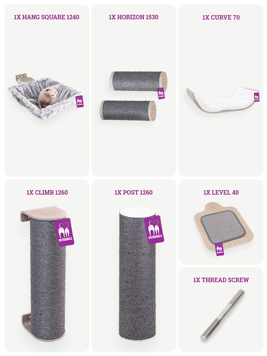Cet ensemble polyvalent peut être assemblé de plusieurs façons. Tenez compte de la taille et de la capacité de votre ou de vos chats à grimper. Pour les chats de petite taille ou qui ont des difficultés à grimper suspendez les pièces à proximité les unes des autres. Pour les chats de grande taille et énergiques, vous pouvez envisager de suspendre les pièces plus loin les unes des autres. Inclus :