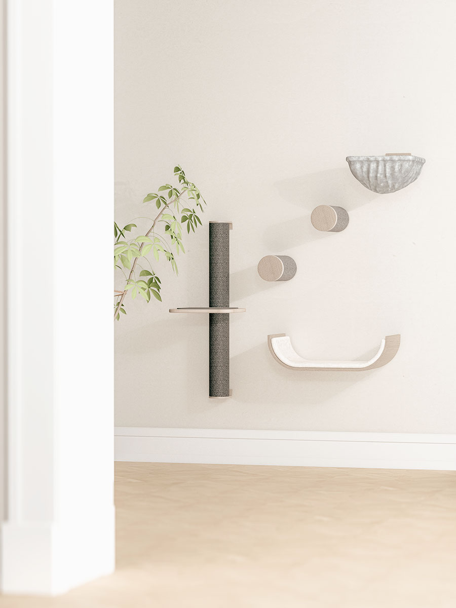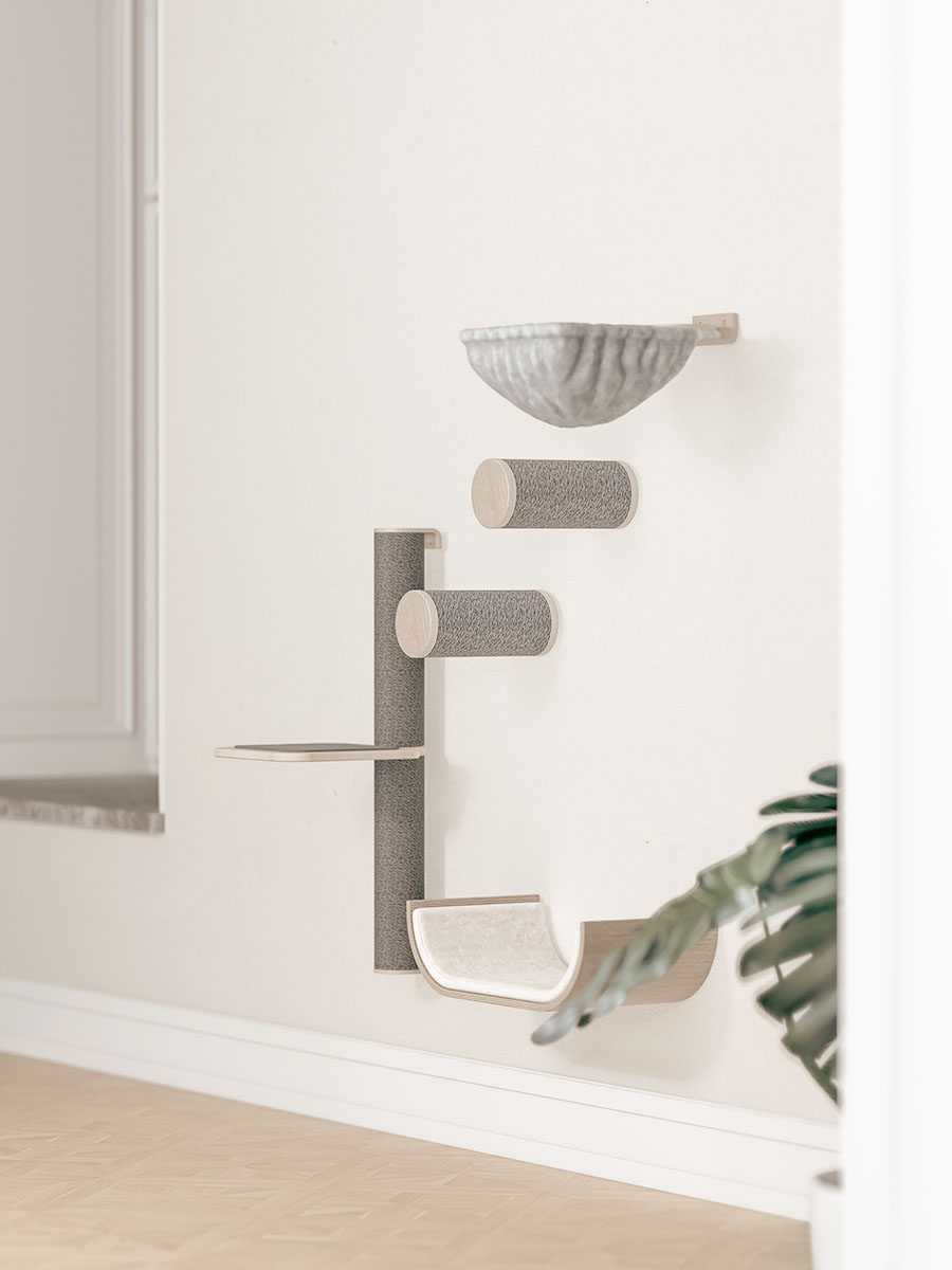 Se prélasser dans ce mur pour chat est une évidence. Votre chat aime-t-il s’étirer et bailler sans vergogne ? Alors vous pouvez être sûr qu’il pourra somnoler confortablement dans le confortable Curve 70. Votre chat rebelle préfère-t-il se lover bien au chaud ? Alors jetez un œil au hamac flottant Hang Square-1240. Les possibilités de couchage ne manquent pas. Mais comment atteignent-ils ces endroits de détente flottants ? Ils peuvent le faire en utilisant les poteaux Horizon ou l’ensemble Climb. Tous habillés de solide corde en sisal pour une adhérence maximale lors de l’escalade.