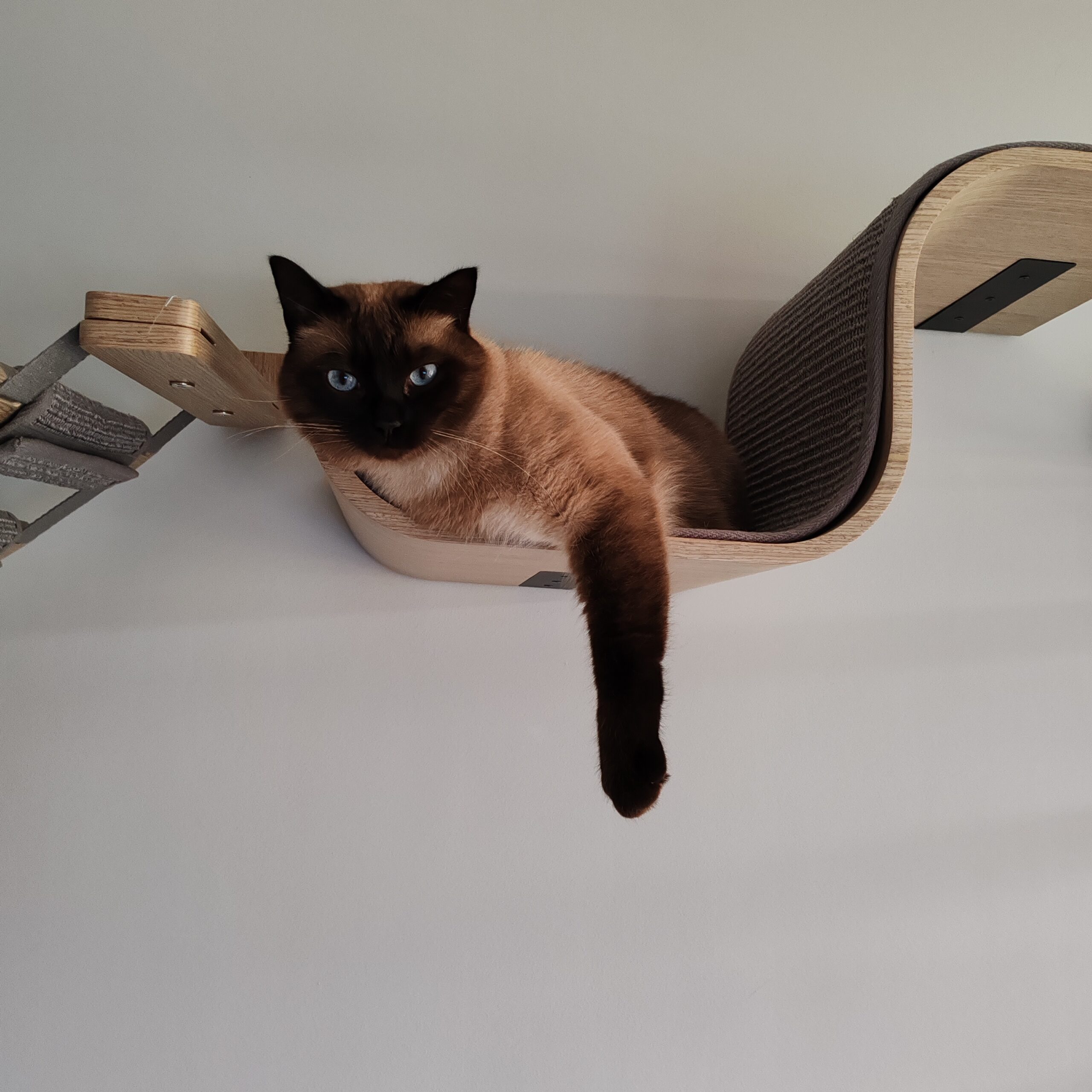 Curve 70 est une étagère murale courbée avec goût, dotée d’un coussin de relaxation et faisant partie de notre collection Wall of Rebels : une belle ligne de produits pour que les chats dorment, jouent, grimpent, courent dessus et griffent. Et que tu peux combiner à l’infini. Ce panier à chat fera le bonheur de tous les chats, car tu peux suspendre Curve 70 au ras du sol pour les chats plus petits et plus âgés. Si ton chat aime s’asseoir en hauteur et n’est pas contre une escalade aventureuse, accroche ce panier à chat bien haut. Et avec les superbes Steps, Horizon, Ladder ou Bridge de la collection Wall of Rebels, tu peux t’assurer que ton chat a un accès facile à tout.