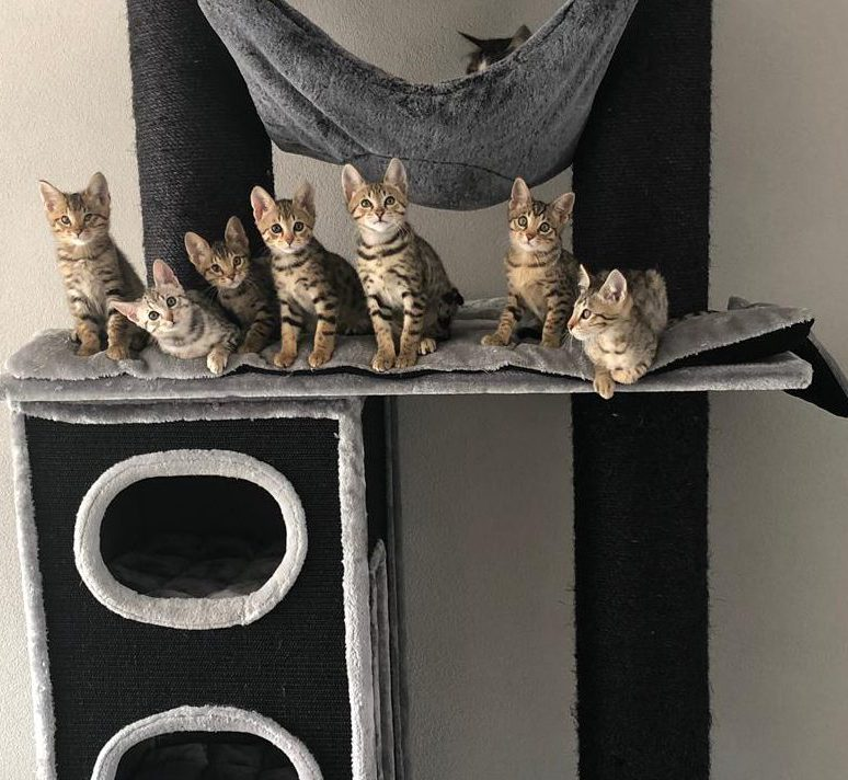 Les chatons élevés sont souvent désignés par la lettre « F » suivie d’un numéro. Un chaton Savannah de type F1 descend directement d’un croisement entre un Serval sauvage et un chat domestique. Un F1 est généralement grand et conserve de nombreux traits sauvages du Serval.