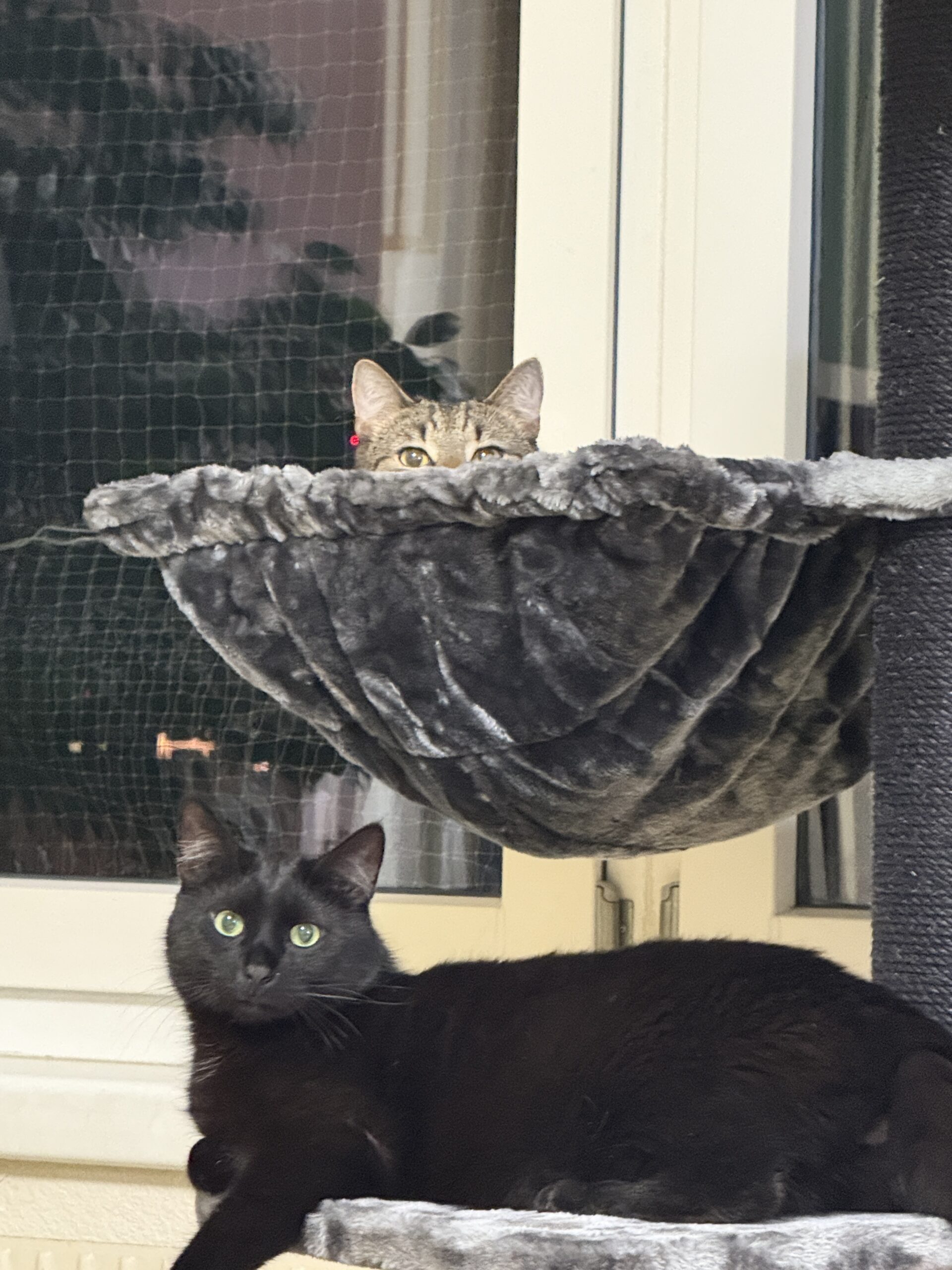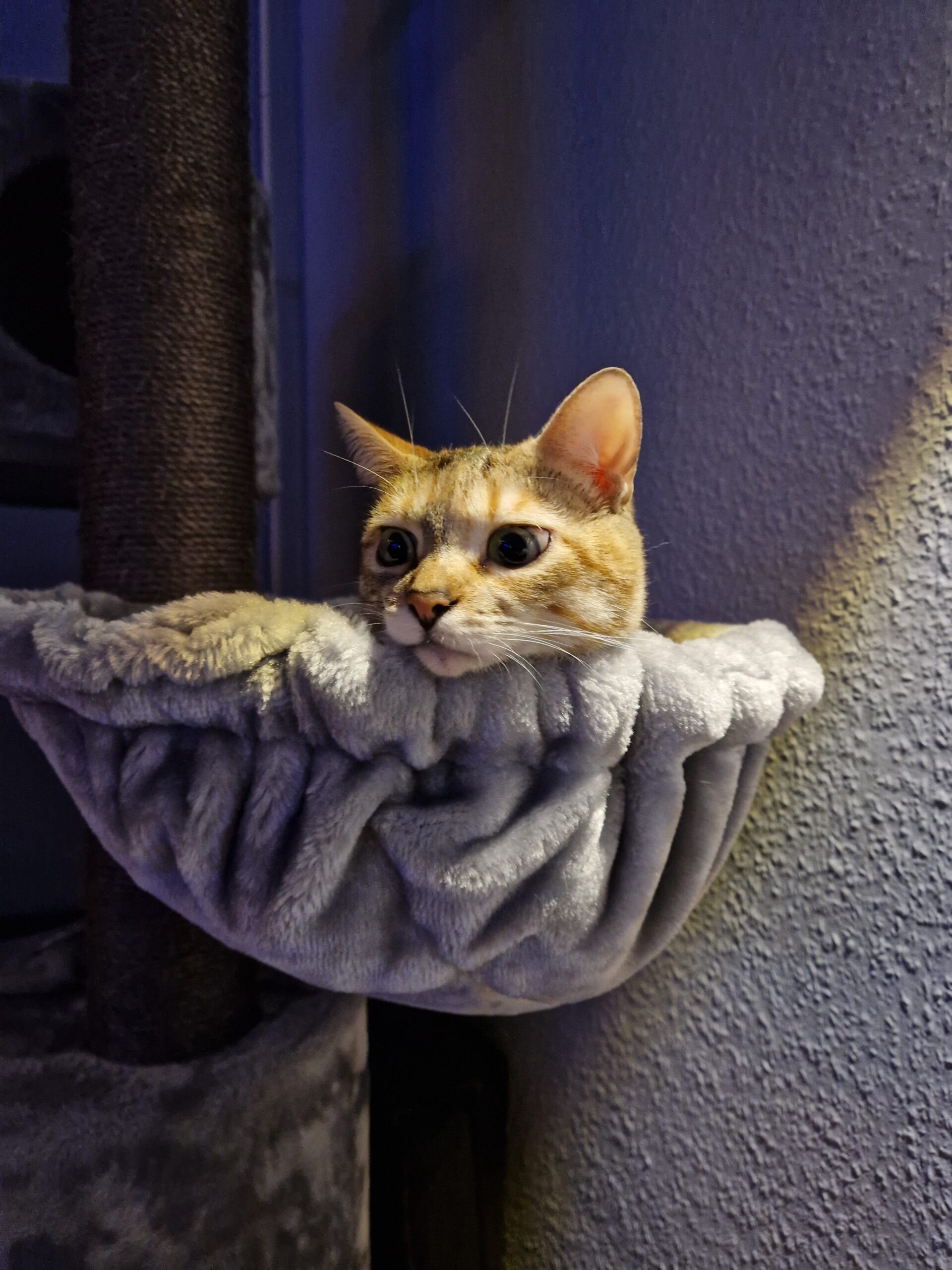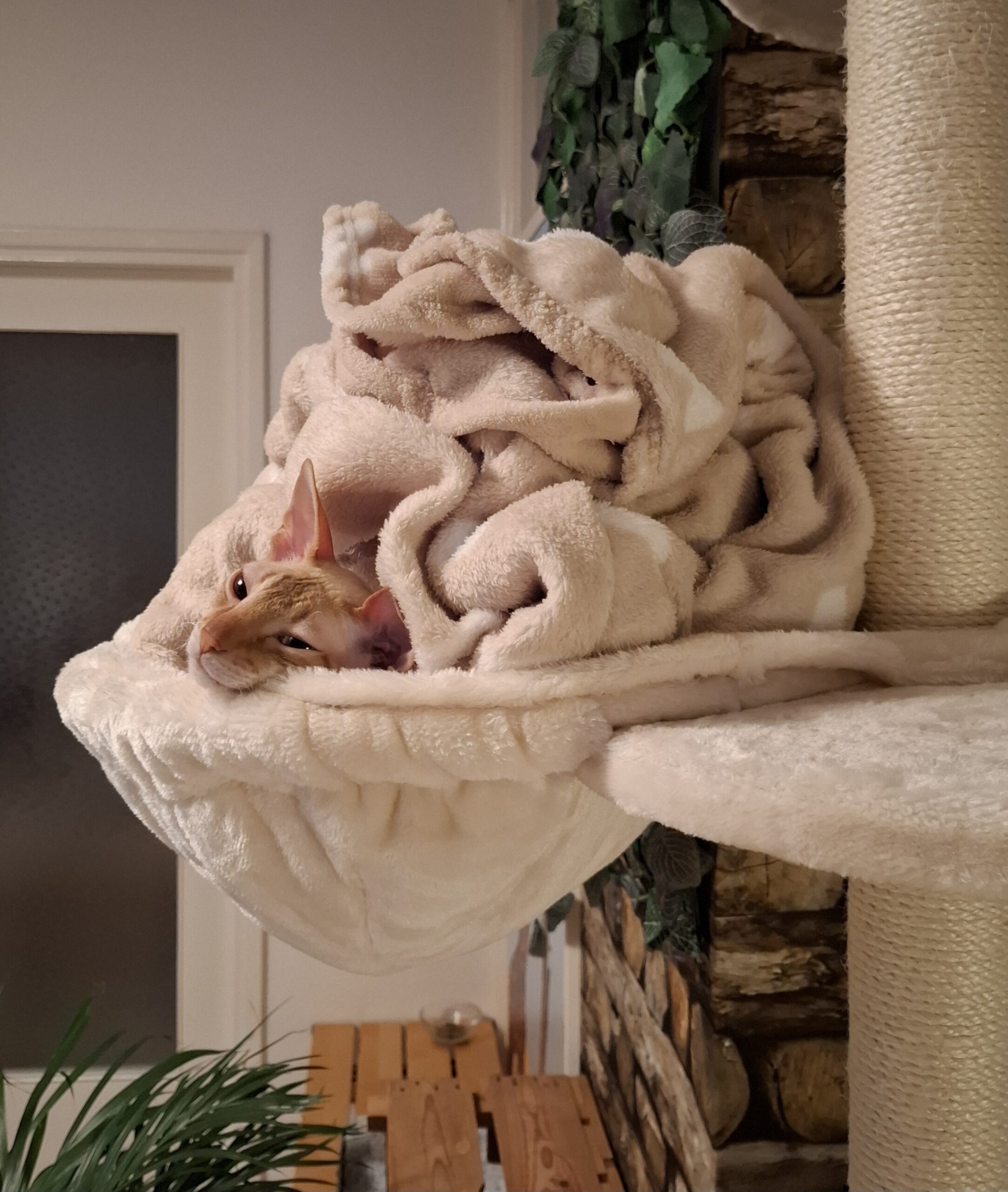 Tip: hou er rekening mee dat door de dikte van het metalen frame van de hangmat, de krabpaal iets minder recht staat.