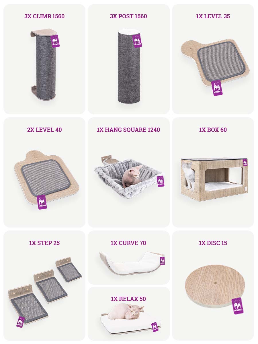 Met deze kattenmuur combiset – samengesteld door kattenexperts – geef je je Rebel alle klim, slaap en krabmogelijkheden zie ze verdienen. Als je Rebels al hun energie hebben gespendeerd aan het klimmen en klouteren op de sisal palen, houten steps en plankjes, dan kunnen ze zich terugtrekken op de superzachte kussens van de Relax 50, Box 60 of Curve 70. Of in de zwevende hangmat, als ze zich helemaal willen verstoppen. Ontworpen met kat-goedgekeurd comfort in het achterhoofd, het is perfect voor rebellen die graag klimmen, krabben en relaxen in stijl!