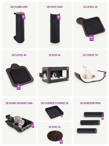 Je Rebels hoeven niet te vechten om een slaapplek in deze uitgebreide combiset. Ze kunnen zich verstoppen in de twee zwevende hangmatten, relaxen in de chique Curve 70 of dutten in de veilige Box 60. We kunnen het ons bijna niet voorstellen, maar zijn ze het dutten beu? Dan heeft deze set genoeg mogelijkheden om te klimmen en te krabben! Het sisaltouw van de palen en het sisaltapijt van de Corner Lounge 35 en Level plateaus bieden extra grip zodat je katten vertrouwen opbouwen tijdens het klimmen. Ontworpen met kat-goedgekeurd comfort in het achterhoofd, het is perfect voor rebellen die graag klimmen, krabben en relaxen in stijl!