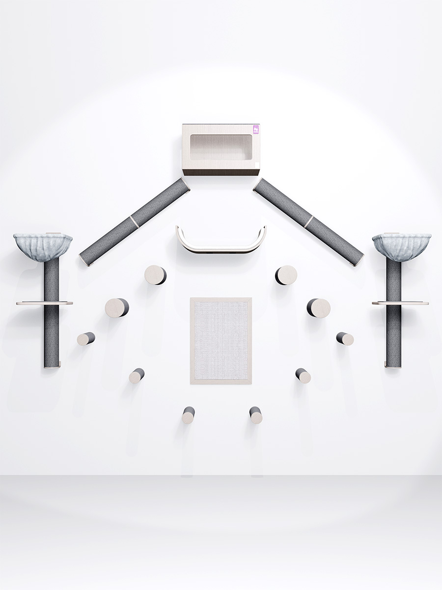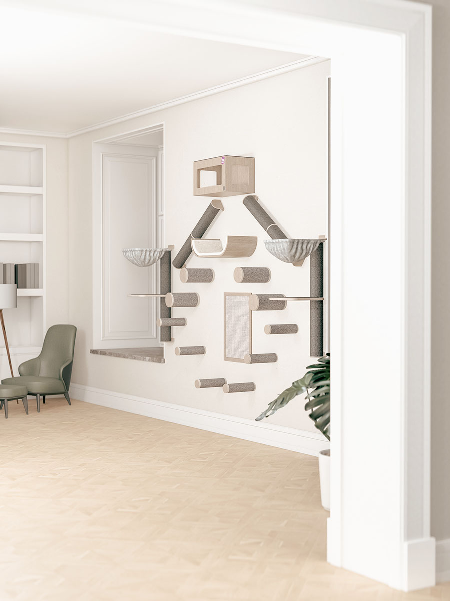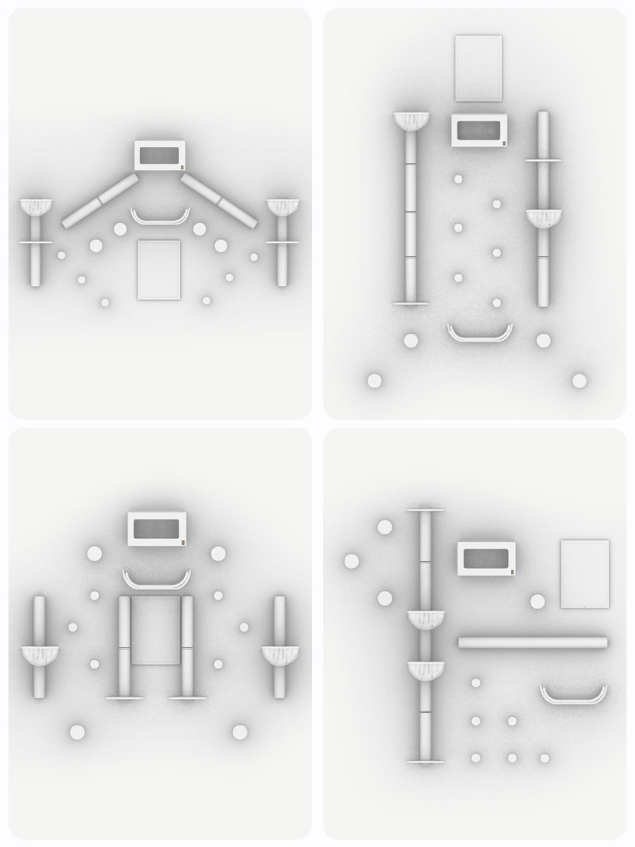 Deze veelzijdige set is op meerdere manieren samen te stellen. Houd rekening met de grootte en klimvermogen van je kat(ten). Heb je kleine katten of hebben ze wat moeite met klimmen? Hang de onderdelen dan dicht bij elkaar. Heb je grote, energieke katten? Dan kun je overwegen de onderdelen verder uit elkaar te hangen.