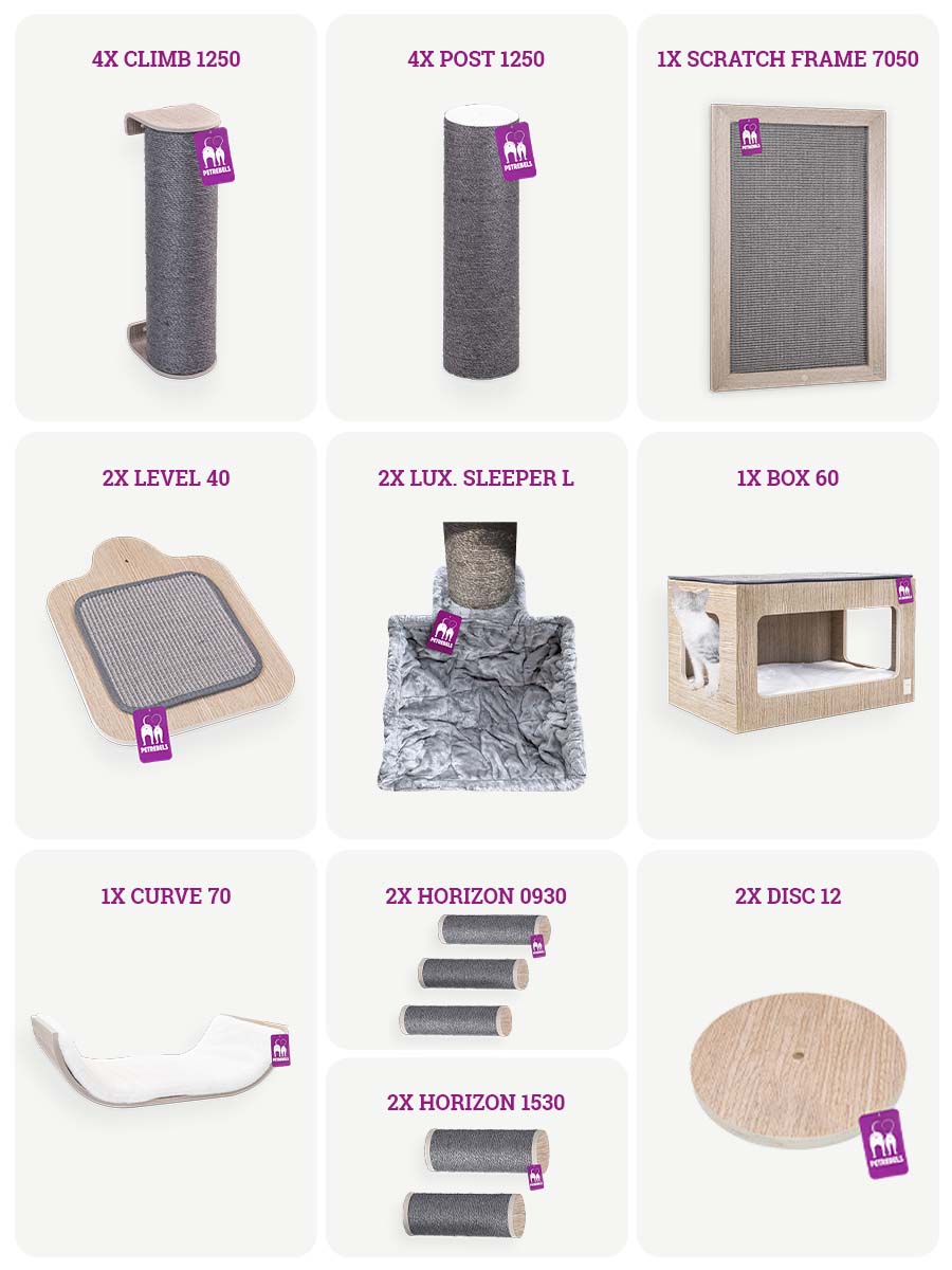 De grootste en gaafste set in ons assortiment! Met deze combiset heb je bijna eindeloze mogelijkheden om je dromen werkelijkheid te maken. Dat klink veelbelovend, en niet zonder reden. Deze kattenmuur biedt enorm veel klimmogelijkheden. Je katten kunnen niet alleen via de 10 Horizon paaltjes elke plek van deze set bereiken, maar ook via de Climb 1250 sisalpalen. Last van scherpe nagels? Geen probleem! Deze set heeft zowel horizontale -als verticale krabmogelijkheden. Klimmen en krabben is vermoeiend, daarom heeft deze combiset meerdere fijne slaapplekken. Ontworpen door kattenexperts met kat-goedgekeurd comfort in het achterhoofd, het is perfect voor rebellen die graag klimmen, krabben en relaxen in stijl!