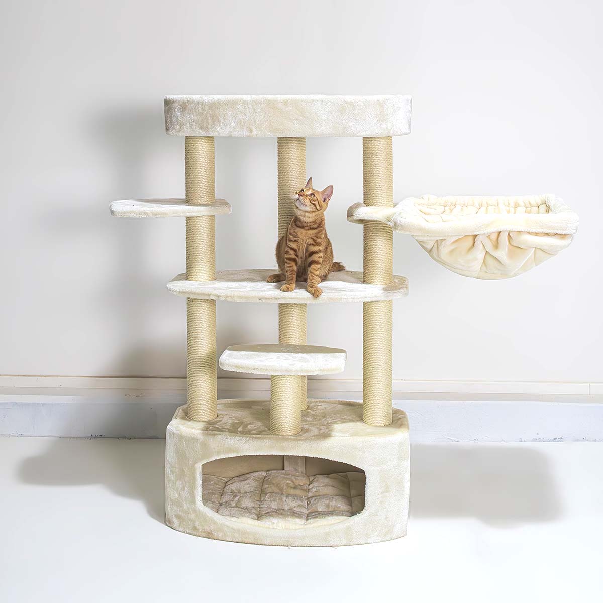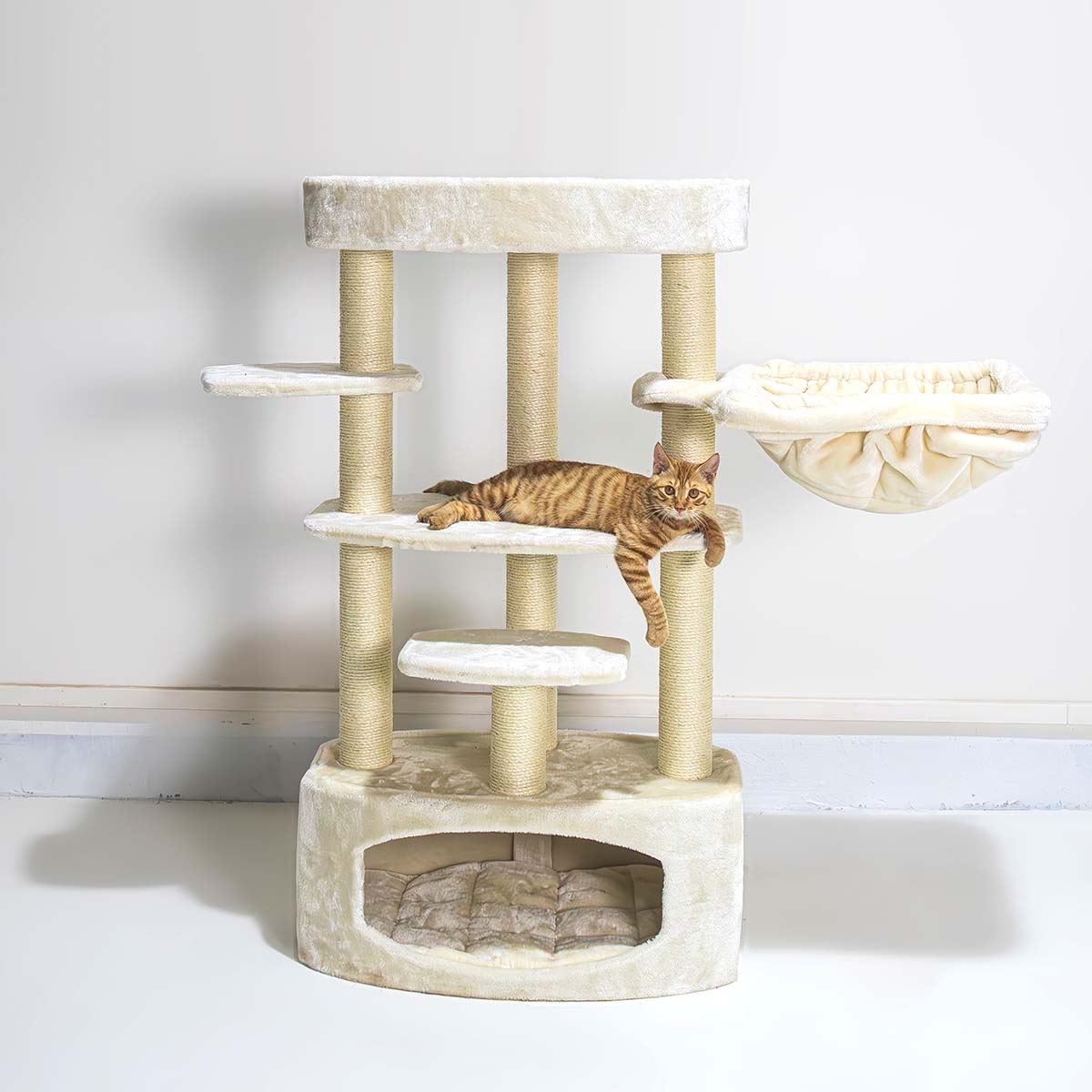 Verdient jouw kat iets leuks, iets waar hij echt blij van wordt? Verwen hem dan met een nieuwe krabpaal. Onze Alexandra 127 bijvoorbeeld. Deze krabpaal is bekleed met de allerzachtste pluche en heeft maar liefst drie heerlijke plekken om veilig in te slapen – een relaxte hangmat, een loungemand én een knus kattenhuisje met een zacht kussen erin. En met hoge krabstammen met stevige sisal en ruime plateaus is dit ook een plek waar je kat heerlijk in kan klimmen en aan kan krabben. Een krabpaal om van te dromen dus!