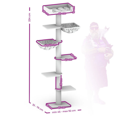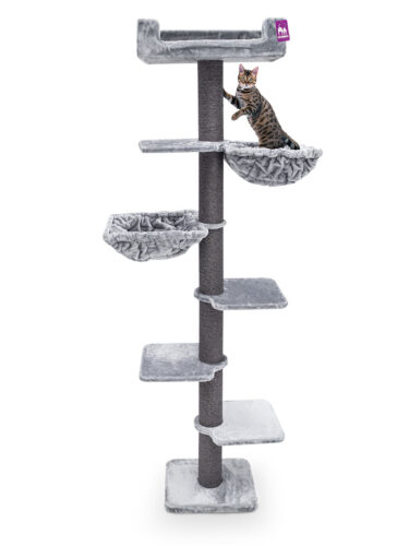 arbre à chat qui pourrait être amélioré, il y avait 2 trous dans le panier du haut alors qu’il n’y a besoin que d’un trou pour fixer le poteau, et le socle pourrait être plus large (par exemple la taille du panier du haut), ça faciliterait la fixation au mur et améliorerait la prise au sol ; les hamacs sont très appréciés et spacieux ; ayant des murs en placo, j’ai supprimé un poteau et une étagère pour que ce soit moins haut, c’est bien ainsi ; et rajouté 3 fixations sur le panier du haut ; 1er achat sur ce site, un peu cher malgré que j’ai profité d’une réduction de 50 €…