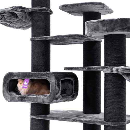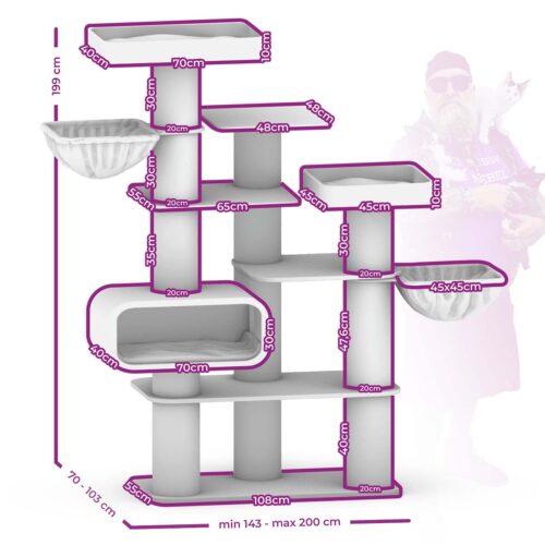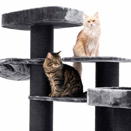 Ons krabmeubel Bengal 199 is een echte reus. Hij is hoog, superstevig en perfect voor (ras)katten die alles willen: klimmen, krabben, slapen en iedereen in de gaten houden. Deze krabpaal heeft veel dikke krabstammen die volop ruimte geven voor robuust krabwerk. En de dikke plateaus zorgen ervoor dat zelfs zware katten moeiteloos naar boven kunnen klimmen – op weg naar een van de zachte loungemanden, het slaaphuisje of voor een chill-sessie in een van de hangmatten. Eigenlijk is deze krabpaal gewoon ideaal!
