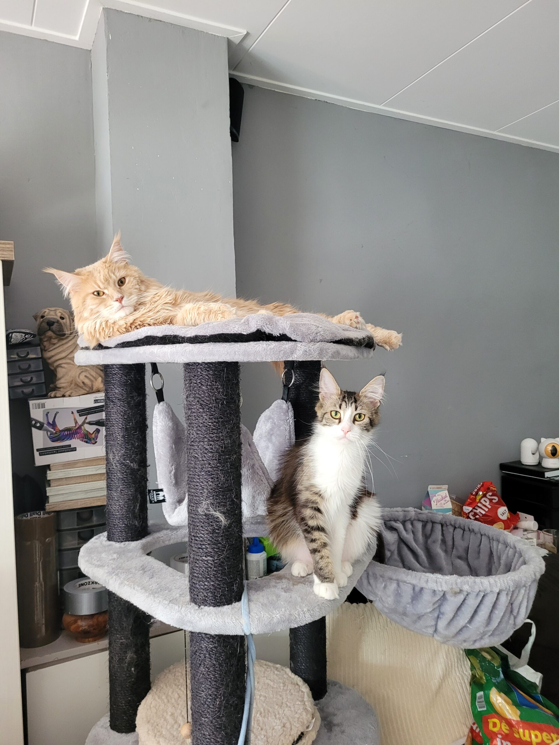Krabpaal wordt hier helaas nauwelijks gebruikt.. bovenste plateau komen ze niet op, wellicht omdat er niks overhelt en ze ‘moeilijk’ naar boven moeten.. en de mandjes zijn voor onze 3 poezen helaas geen succes.
