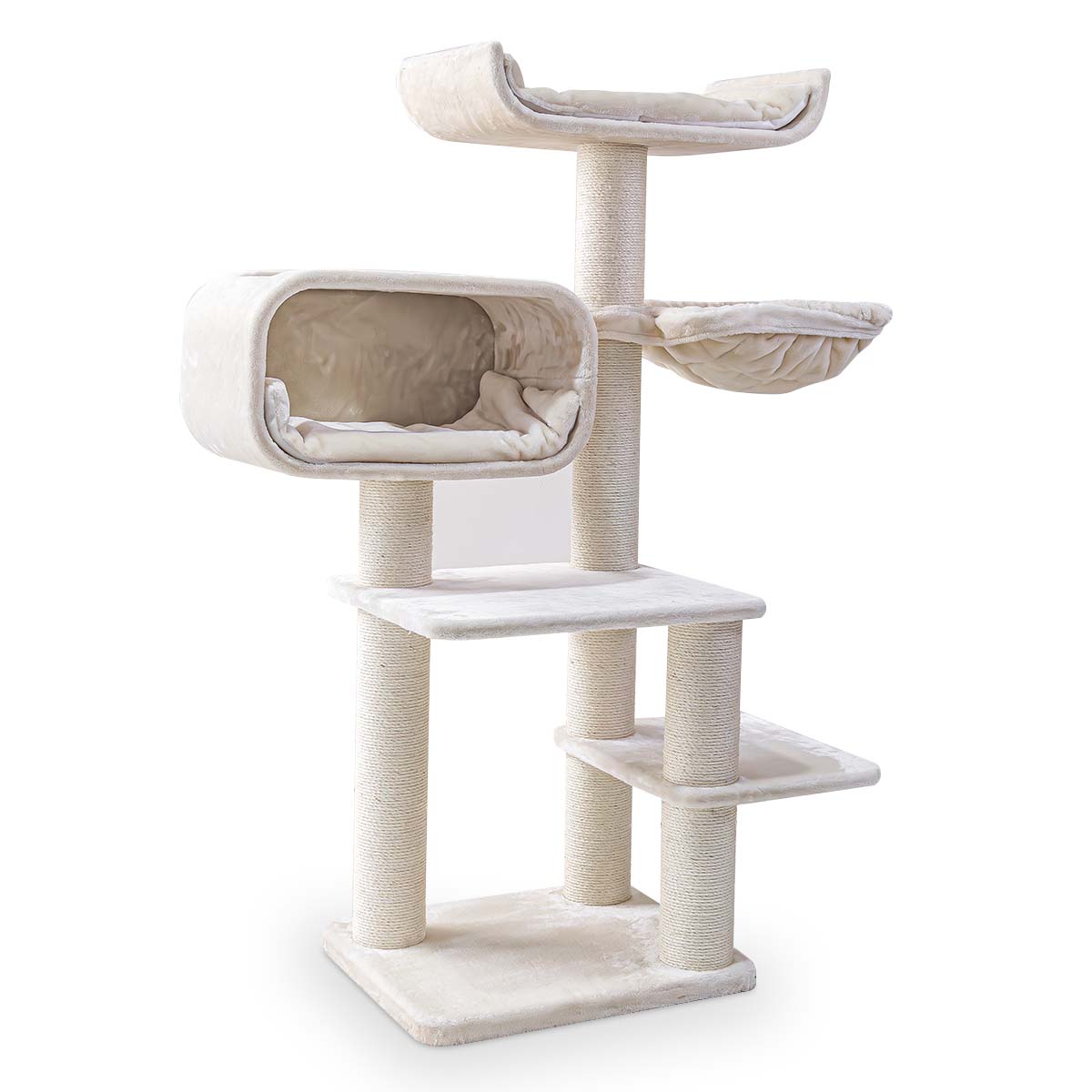 Krabpaal Estate 157 mag je eigenlijk geen kattenmeubel noemen. Dit is een villa. Een luxe villa, speciaal voor katten. Deze krabtoren is indrukwekkend hoog, slim ingedeeld en helemaal bekleed met zachte pluche. En daarom een ultiem speel- en krabparadijs voor katten. Of je nou een Ragdoll, Noorse Boskat of een ‘gewone’ huis-, tuin- en keukenkat hebt: op deze krabpaal voelt elke Rebel zich thuis. Er is een XXL-slaaphuis voor slaapkoppen, een relaxmand met het mooiste uitzicht en een hangmat halverwege om even in te relaxen. En door de plateaus is deze krabtoren ook heel geschikt voor oudere katten of katten die niet zo goed kunnen klimmen en springen.