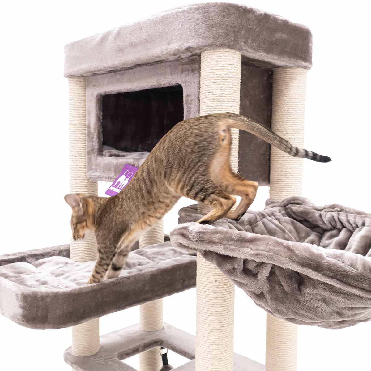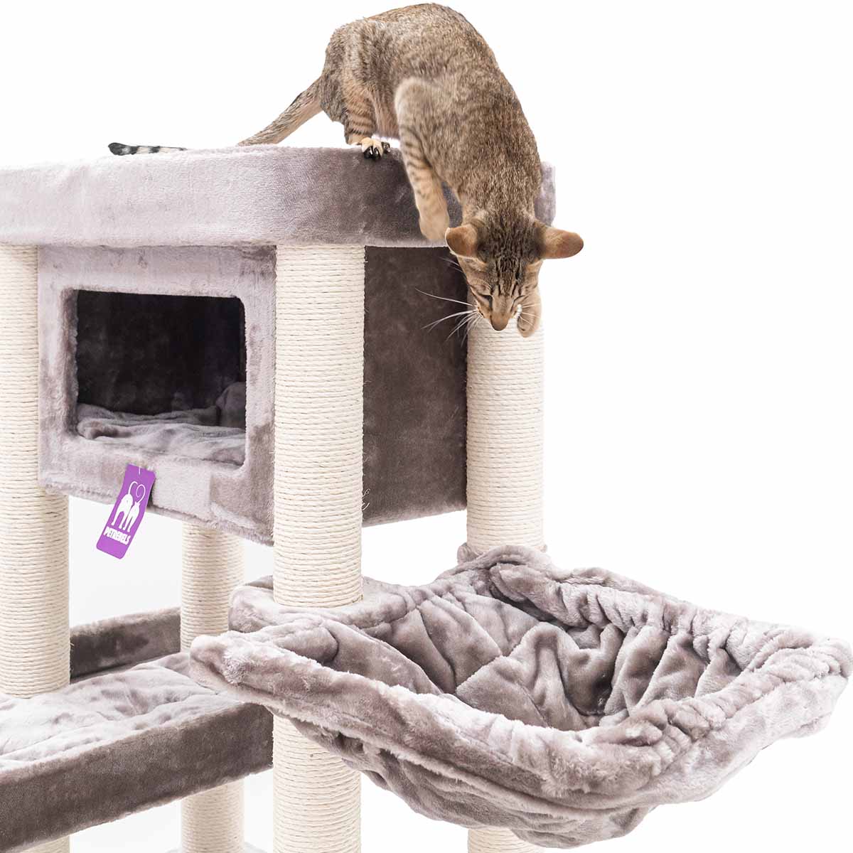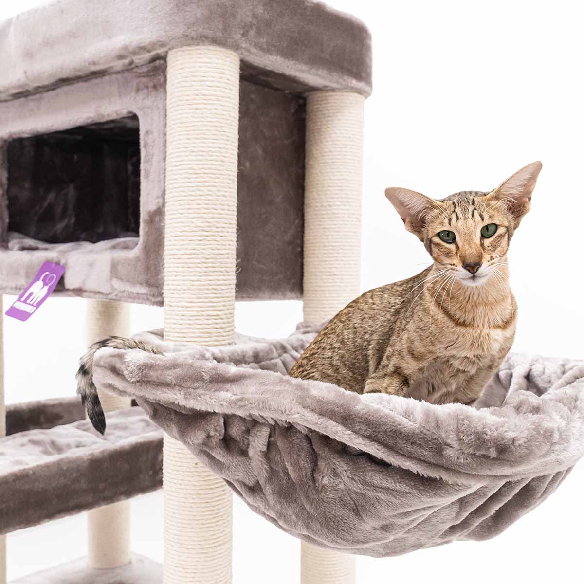 Met een hoogte van 150 cm is de Mansion 150 een krabpaal die je niet snel over het hoofd ziet. Want strak design in combinatie met verrassend veel comfort, dat wil toch elke kat? De rechte lijnen maken hem stoer terwijl de zachte pluche en het slimme ontwerp voor pure luxe voor je kat zorgen. Deze krabpaal heeft het allemaal: een royale hangmat onderin, een fijn slaaphuisje, een speels kruipgat in het eerste plateau en een XXL-loungemand bovenin om in te chillen. Deze krabpaal is compact en dus ook heel geschikt voor wat kleinere kamers. Maar laat je niet foppen door z’n formaat – hier passen met gemak meerdere katten op!