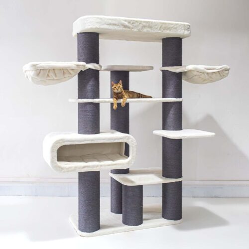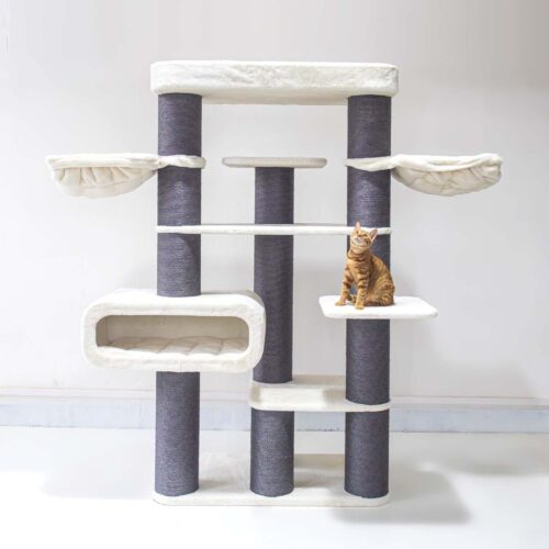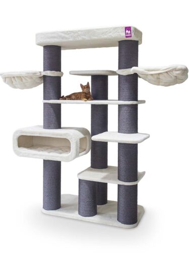Krabpaal Norwegian 198 is een echte kanjer: hij is hoog, superstevig en stabiel. Grote, zware en actieve (ras)katten kunnen hun hart ophalen op dit krabmeubel met eindeloos veel toffe ‘features’, zoals dikke krabstammen met sterke sisal, een stabiele bodemplaat en eindeloos veel plekken om te relaxen. Jouw Rebels kunnen hier heerlijk in klimmen, aan krabben en op springen. En na zo’n actieve dag kan je kat heerlijk wegdromen in een van de hangmatten, het slaaphuisje of een van de XXL-loungemand bovenin.