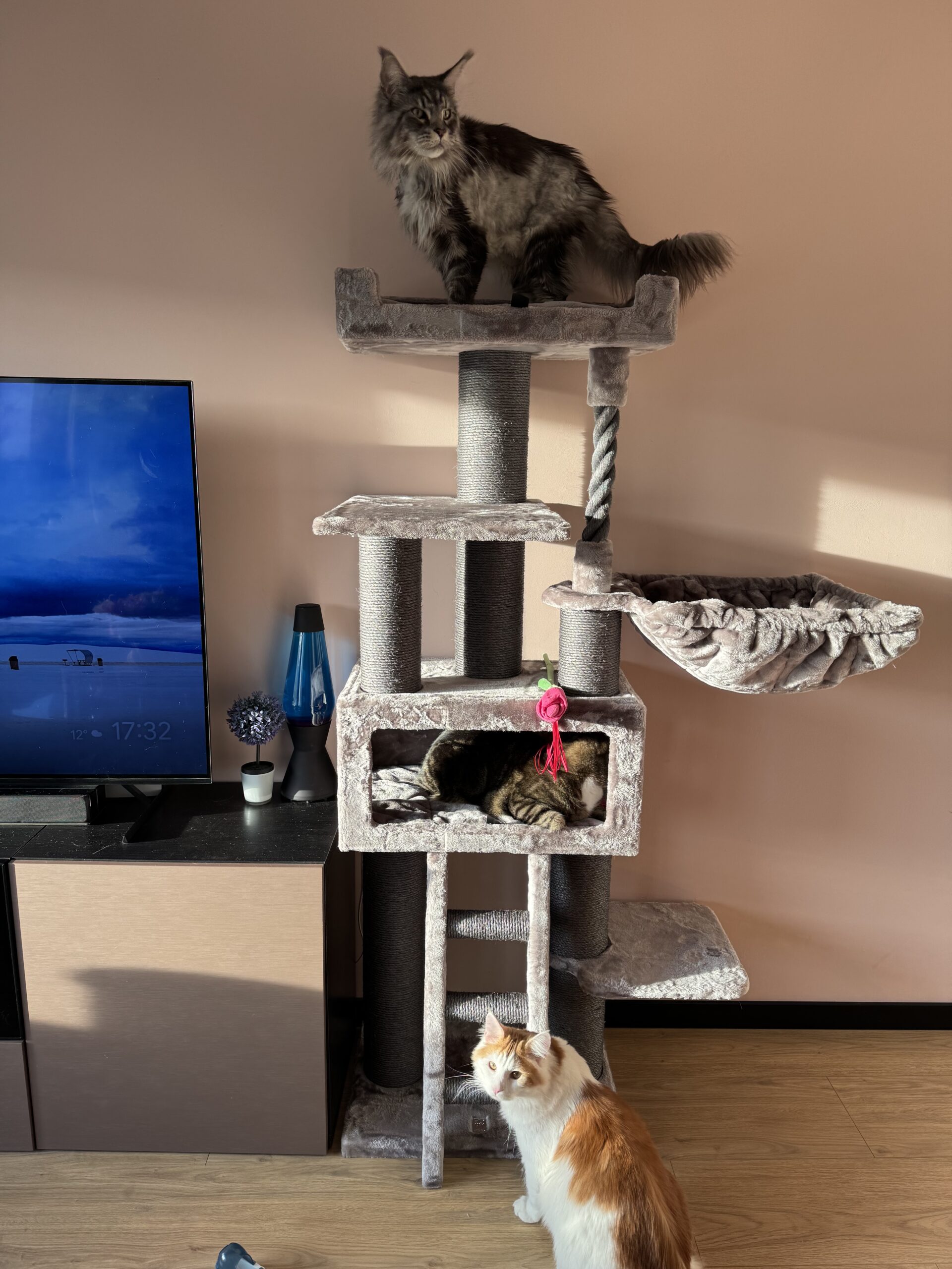 Wir lieben die pinken Kartons. Der Aufbau war super easy. Die Hängematte ist flexibel also haben wir sie so aufgehängt wie es bei uns passt. Die Maine Coon und Britisch-Kurzhaar lieben den Baum beide und probieren verschiedene Schlafplätze aus. Sieht schick und hochwertig aus.