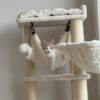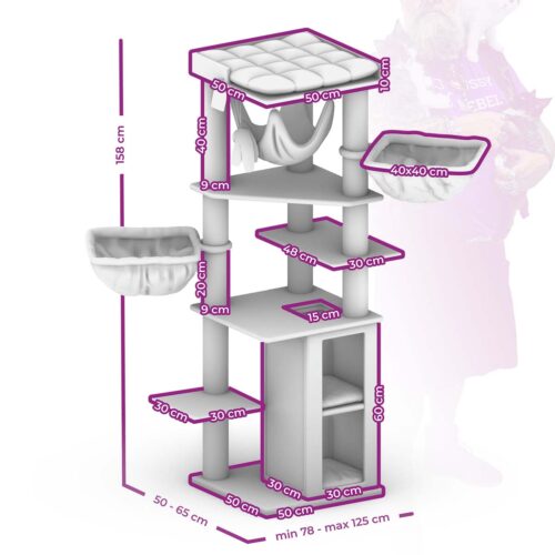 Dit is wat elke kat wil – een krabpaal (of: krabtoren) die bijna net zo hoog is als de visite. Want vanaf het met fluweelzachte pluche beklede plateau bovenin kan je kat alles in de gaten houden. Maar dat is nog lang niet alles. Deze super-de-luxe krabpaal heeft ook fijne hoge krabstammen om in te klimmen, een krabton onderin met extra slaapplateau en maar liefst drie hangmatten om een heerlijk schoonheidsslaapje in te doen!