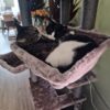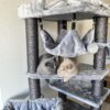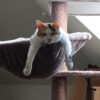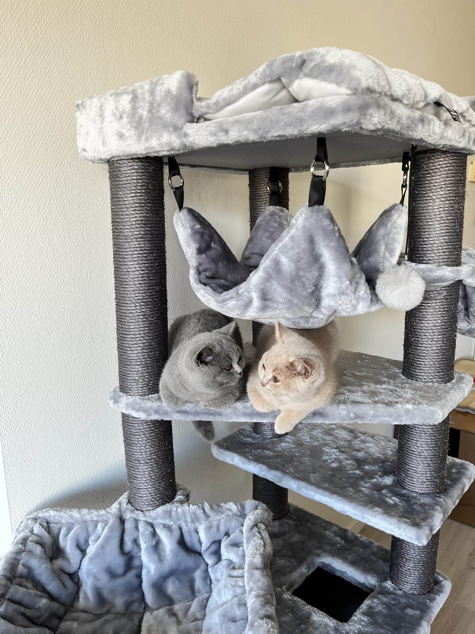 Heerlijk stevige krabpaal waar onze drie gekken heel erg blij mee zijn! Het bovenste mandje hebben we verplaatst naar de andere paal, dat kwam mooier uit met de inrichting hier. Twijfels over het hangmandje, daar doen ze nog niet zoveel mee. De bovenste plank is mega favoriet. Er is regelmatig een gevecht voor “King of the Hill”!
