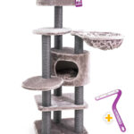 Dit is wat elke kat wil – een krabpaal (of: krabtoren) die bijna net zo hoog is als de visite. Want vanaf het met fluweelzachte pluche beklede plateau bovenin kan je kat alles in de gaten houden. Maar dat is nog lang niet alles. Deze super-de-luxe krabpaal heeft ook fijne hoge krabstammen om in te klimmen, een krabton onderin met extra slaapplateau en maar liefst drie hangmatten om een heerlijk schoonheidsslaapje in te doen!