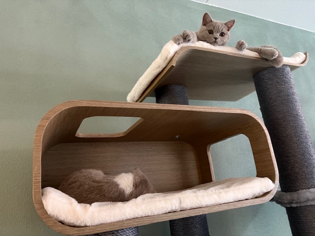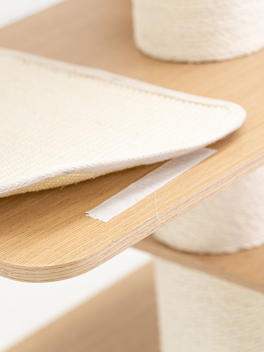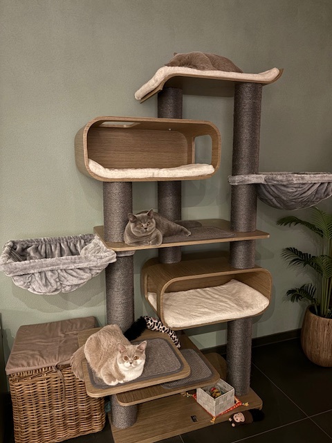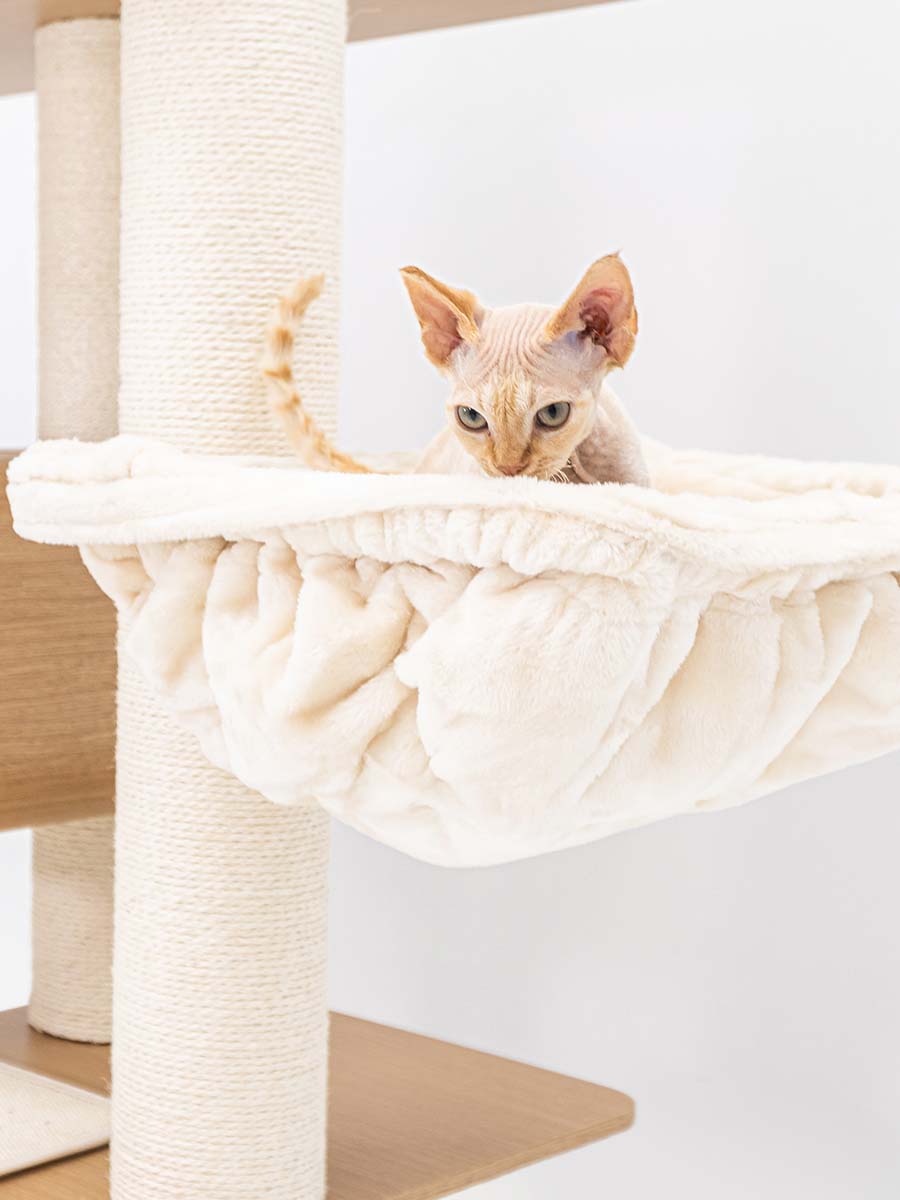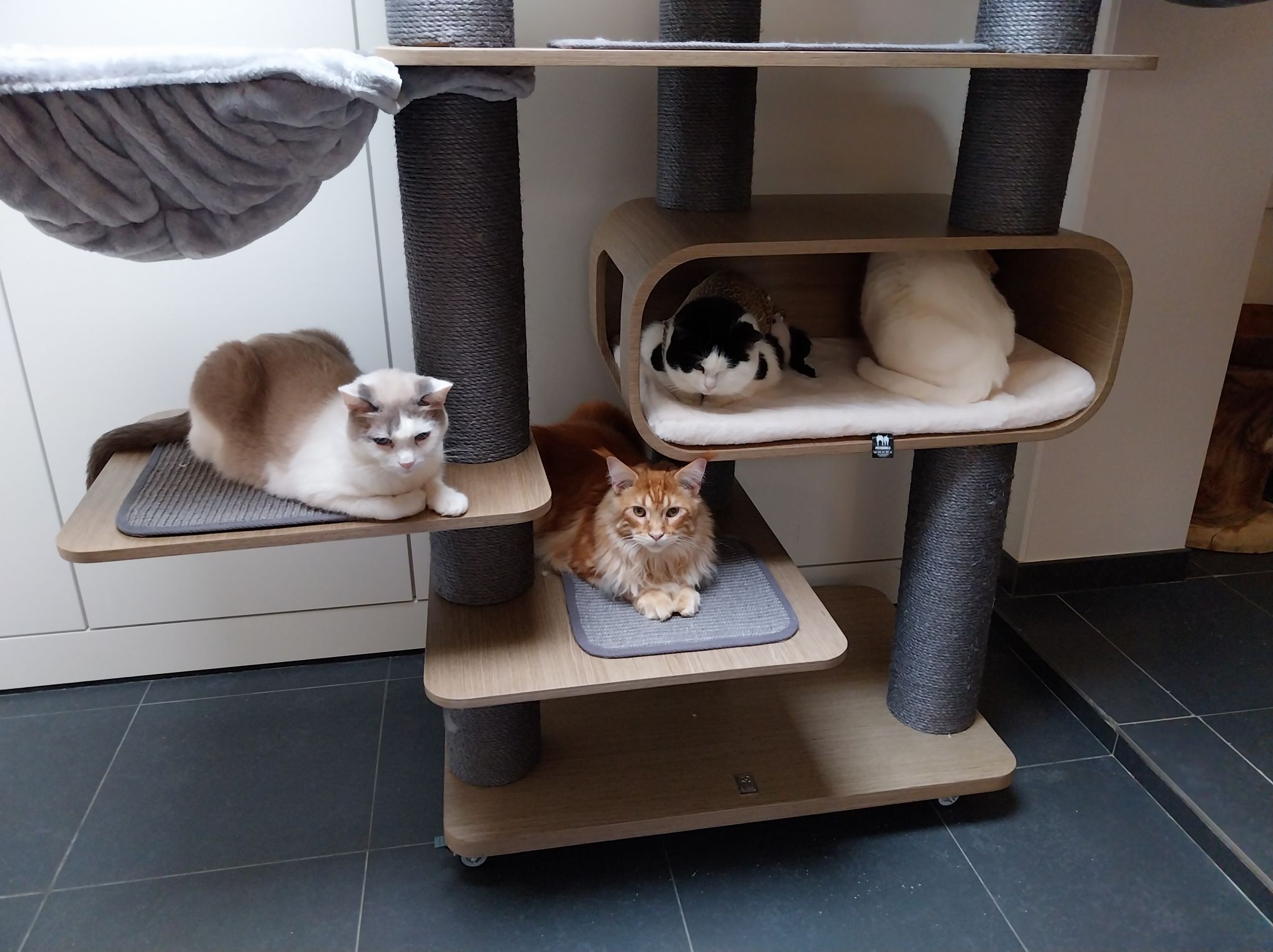 Heel mooi,juist jammer dat je de krabpaal uit mekaar moet halen om de hangkussens eruit te halen.