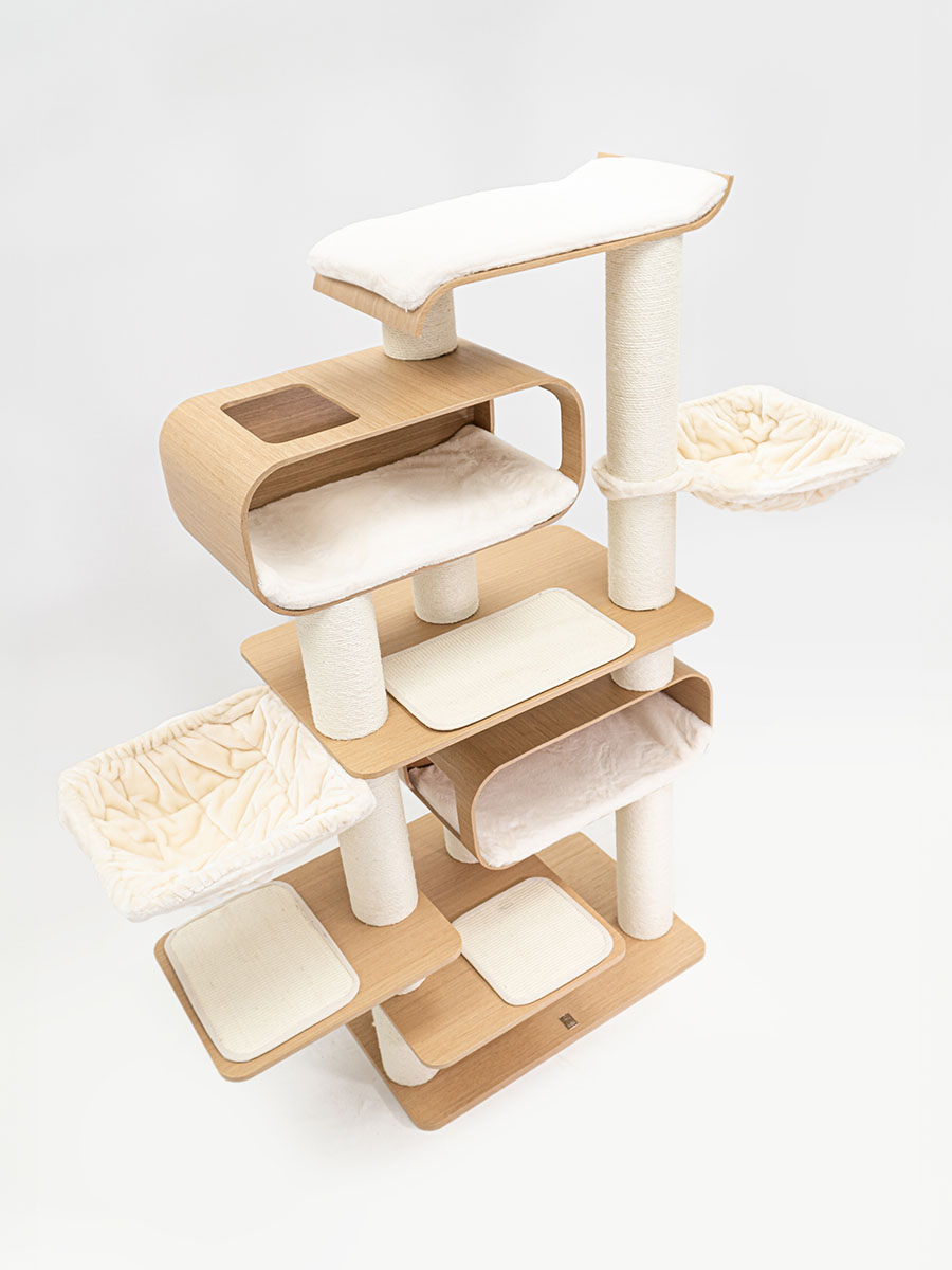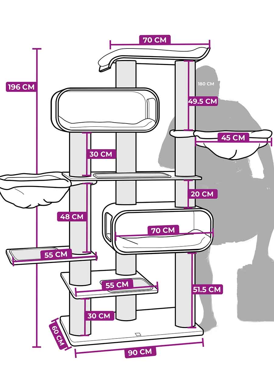 De Virgo 196 is met recht een supermodern krabmeubel wat fantastisch staat in je living. Deze krabpaal is hoog en een echte blikvanger in je huis – hij is mooi, luxe afgewerkt en past door de matching kleuren in elk interieur. Maar belangrijk natuurlijk is dat deze krabpaal een feestje is voor katten. Echt alles wat je kat nodig hebt zit erop: een XXL-loungemand bovenin, twee zachte uitwasbare hangmatten om in te relaxen en twee heerlijk grote kattenhuizen. Alles met zachte pluche en lekker dikke sisal om aan te krabben. Dit is de perfecte krabpaal voor jouw kat!
