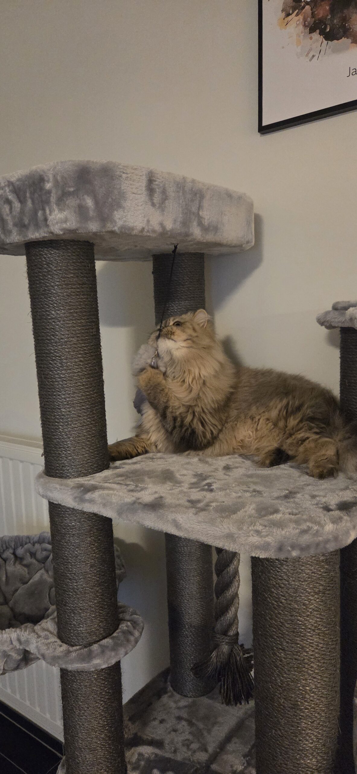 Voor ons was het belangrijk dat ze makkelijk van boven naar beneden konden en dus niet van 170cm naar beneden sprongen en dat kan bij deze paal echt perfect, dan wilde wij verschillende slaapplaatsen maar niet teveel huisjes of hokjes waar ze in kunnen want die 2 van ons gaan er nooit in, en deze heeft er 1 waar we nu hun speeltjes in leggen Did ze er zelf weer uit halen.