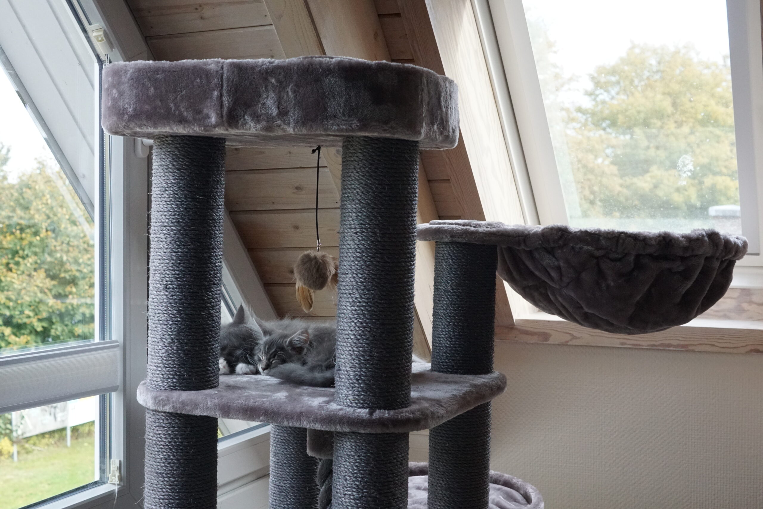 Voor iedere Coon wat wils, hangen, liggen, krabben en spelen? Het kan allemaal tegelijk.
