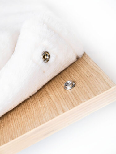 - Kleuren – off-white pluche en rusty oak veneer